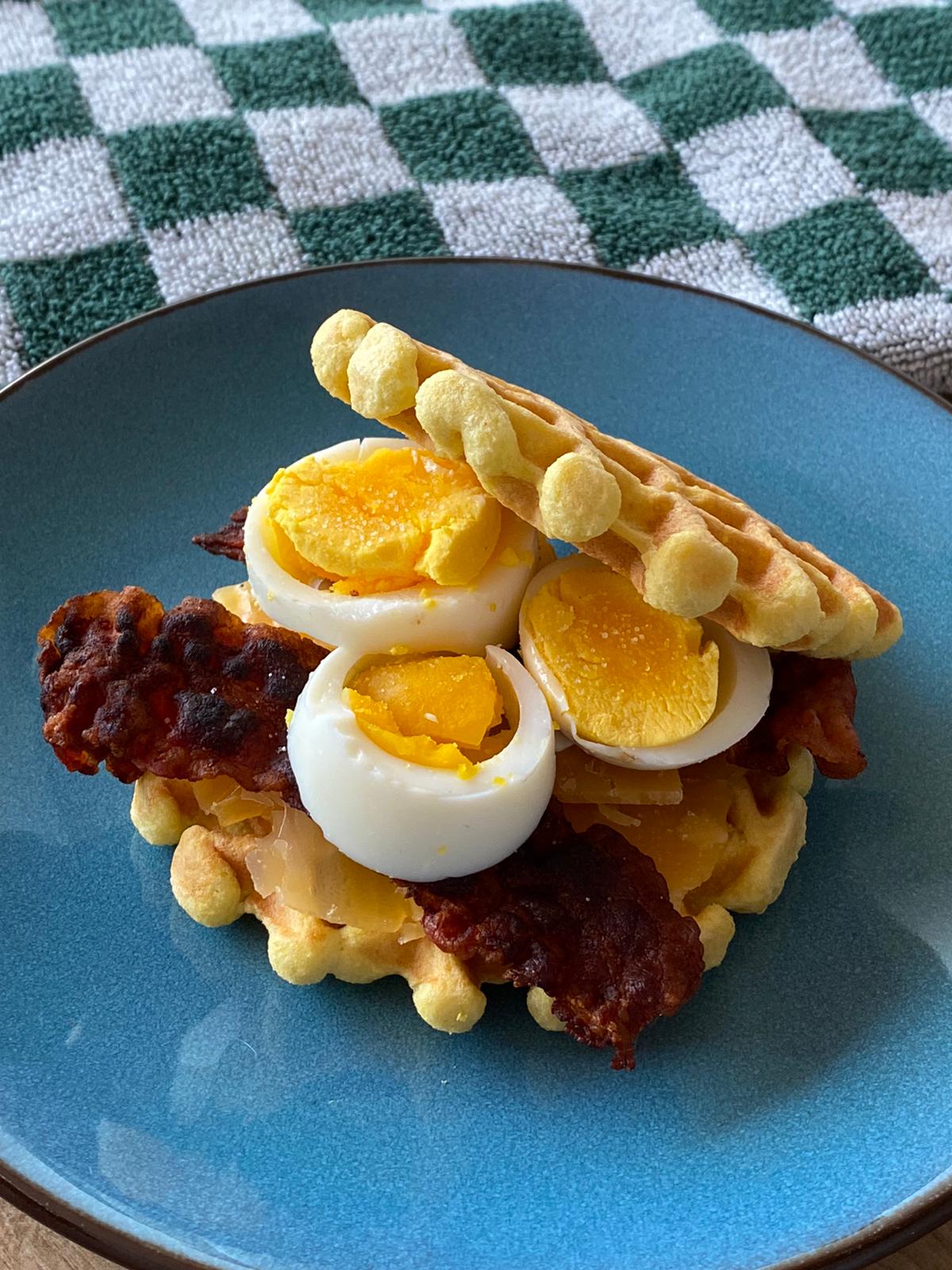 - Beleg de wafels met het spek, plakje kaas en het gekookte ei