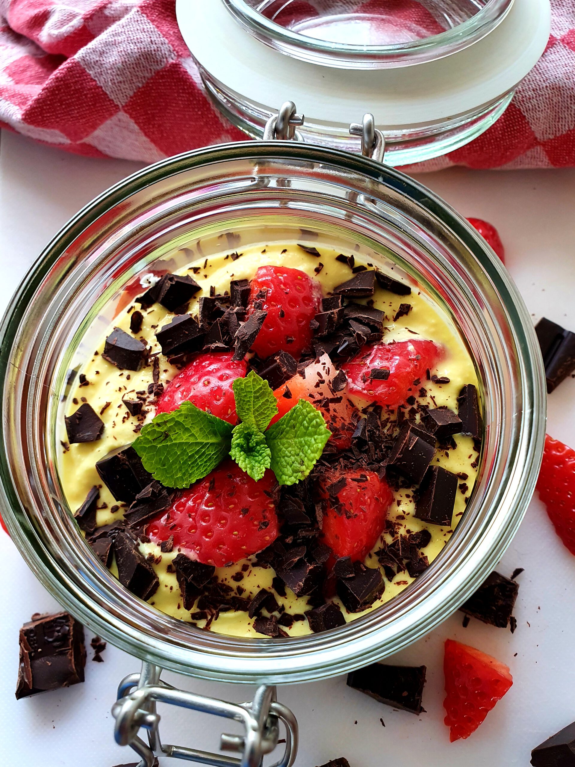 Deze suikervrije vanille vla is heerlijk romig van smaak. De chocola en de aardbeien geven de vla een extra lekkere bite.